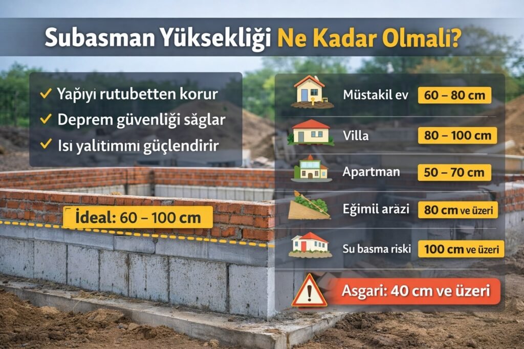 Subasman yüksekliği, bir yapının zemin seviyesinden itibaren temel üst kotuna kadar olan yüksekliğini ifade eder ve binanın dayanıklılığı açısından kritik öneme sahiptir. Türkiye’de genel uygulamalara göre subasman yüksekliği en az 40–50 cm, ideal olarak ise 60–100 cm arasında olmalıdır. Bu yazıda subasman yüksekliğinin ne olduğu, neden önemli olduğu, yönetmeliklere göre ideal ölçüler ve yanlış subasman uygulamalarının doğuracağı sorunlar detaylı şekilde ele alınmaktadır.