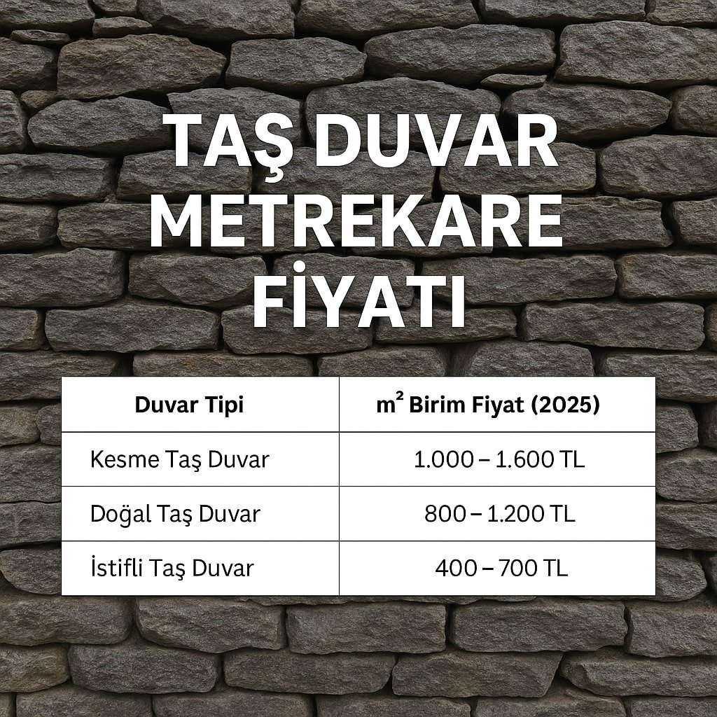 Taş duvarın metrekare fiyatı 2025 yılı itibariyle ortalama 2000 TL ile 3.500 TL arasında değişmektedir. Bu fiyat; kullanılacak taşın cinsi, duvarın yüksekliği, uygulama alanının zorluk derecesi ve işçilik kalitesine göre değişiklik gösterir. Net fiyat için profesyonel keşif yapılması tavsiye edilir.